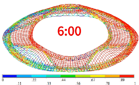 項目組建技術(shù)攻關(guān)團隊,確定“內(nèi)外環(huán)正反序”同步卸載方案,屋蓋鋼結(jié)構(gòu)外環(huán)桁架卸載變形量小,采取同步割除支撐胎架方式進行卸載,內(nèi)環(huán)及星型桁架整體變形量大,采用“超大型構(gòu)件液壓同步卸載技術(shù)”,保證整體卸載過程平穩(wěn)、高效進行。