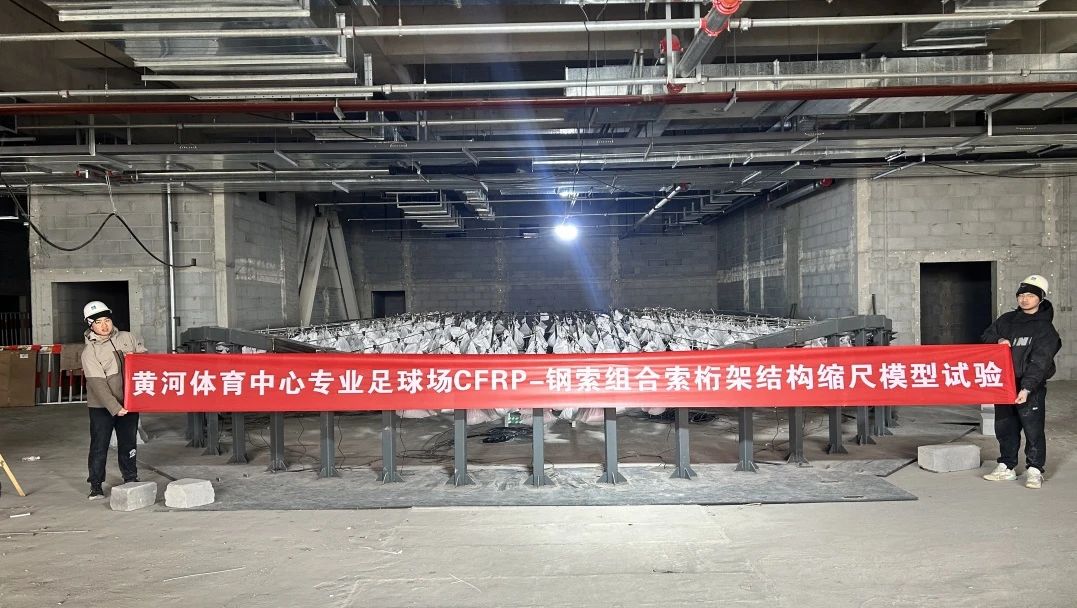 項目博士工作站聯(lián)合天津大學(xué),設(shè)計國內(nèi)首個縮尺比例為1/15的CFRP索桁架整體模型,開展靜力加載、張拉成型與斷索測試,3大力學(xué)試驗解決索桁架張拉成型過程中的強非線性、大變形技術(shù)難題,確保最終張拉型態(tài)符合設(shè)計要求,為下步施工奠定理論基礎(chǔ)。
