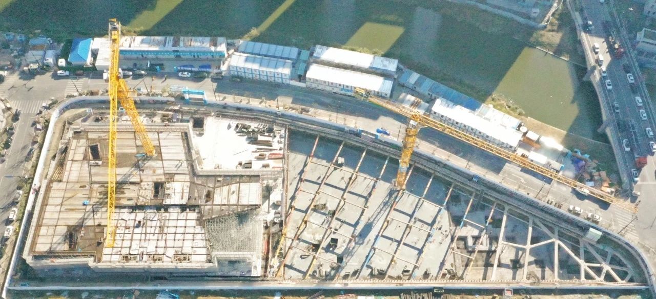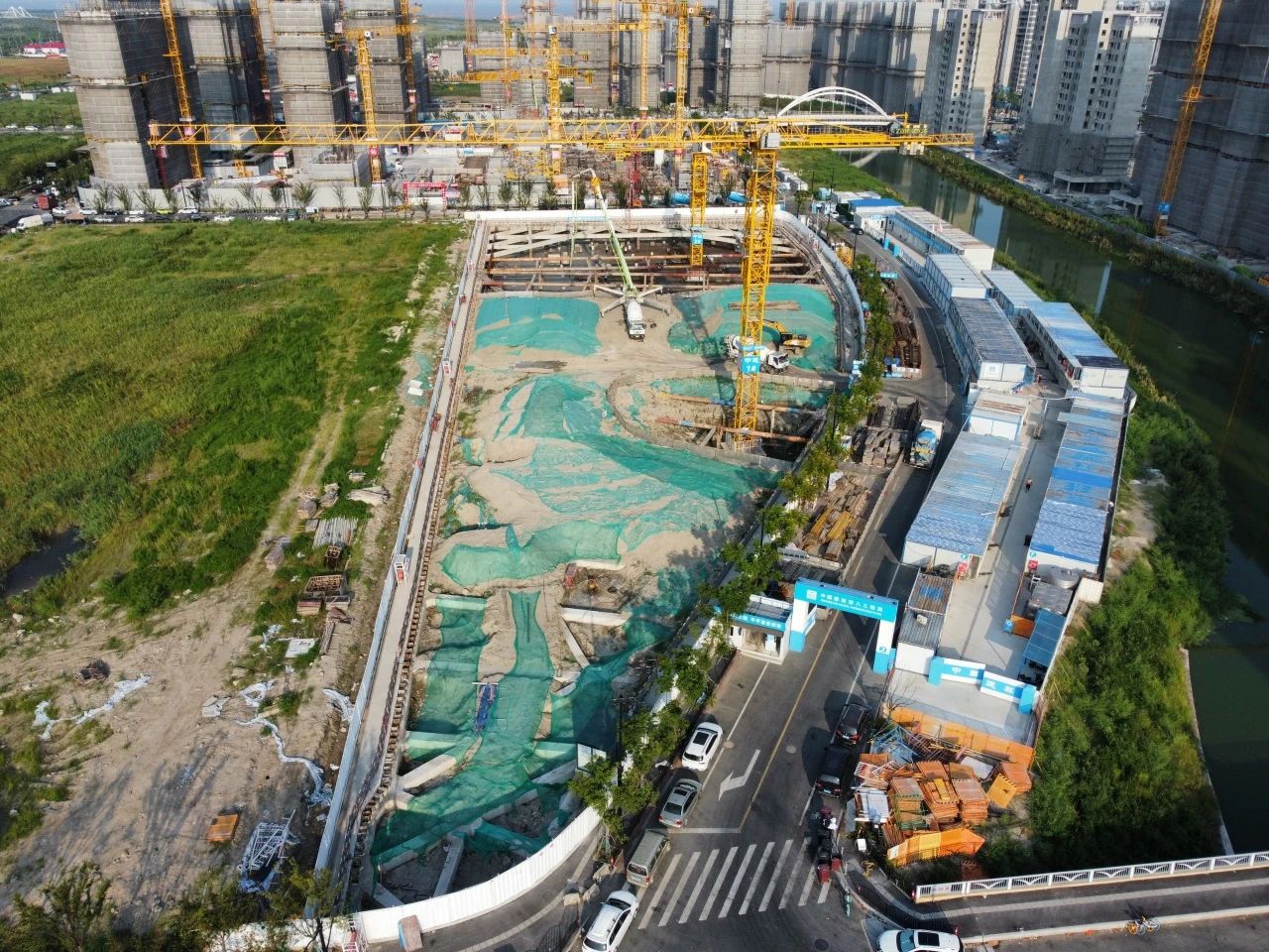 項(xiàng)目應(yīng)用“先撐后拆”施工方法,通過(guò)“開挖一段土方、施工一段基礎(chǔ)拆除一段圍護(hù)”的方式,在狹小空間里“靈活作戰(zhàn)”應(yīng)用“鉆孔灌注樁+高壓旋噴樁”減小機(jī)械占用空間,以抬高正負(fù)零標(biāo)高0.5米的方式,使基坑與周邊場(chǎng)地持平,避免雨季內(nèi)澇隱患,保障項(xiàng)目如期封頂。