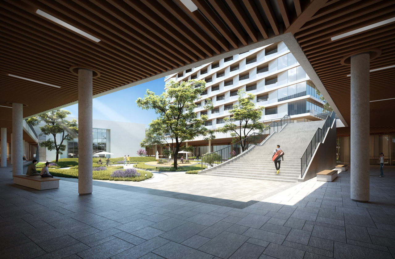 項目在“大平臺”中部打造下沉庭院,將首層訓(xùn)練館降低到與負(fù)一層平齊,使內(nèi)部場地和城市道路天然隔開,為運動員創(chuàng)造安靜私密的內(nèi)向性空間,且降低了龐大體量對臨近道路造成的壓迫感。