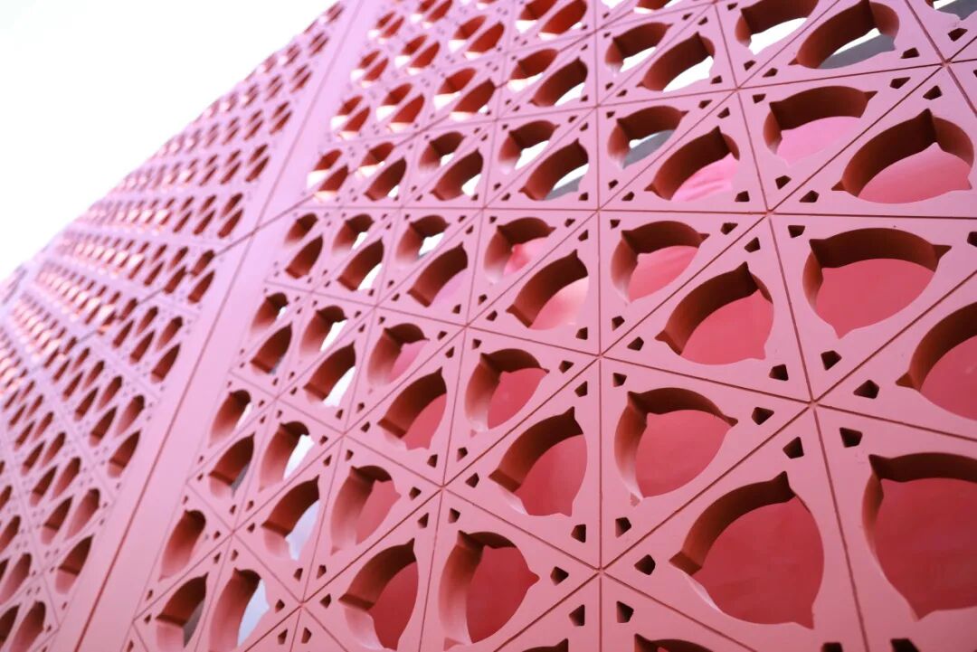 項(xiàng)目采用 “三段式” 古典宮殿結(jié)構(gòu),將太和殿的重檐、中和殿的寶頂、保和殿的屋脊曲線等經(jīng)典意象融入設(shè)計(jì)之中。為還原那抹莊重的 “故宮紅”,項(xiàng)目團(tuán)隊(duì)歷經(jīng) 6 個(gè)月、上百次的配比試驗(yàn),研發(fā)出 UHPC 超高性能混凝土幕墻。該幕墻強(qiáng)度達(dá)常規(guī)混凝土的 3 至 4 倍,且在材料中加入了 304 不銹鋼纖維,有效提升結(jié)構(gòu)抗裂性能,形成對 UHPC 飾面故宮紅的防褪色技術(shù),確保紅墻在百年風(fēng)雨中依舊鮮艷。