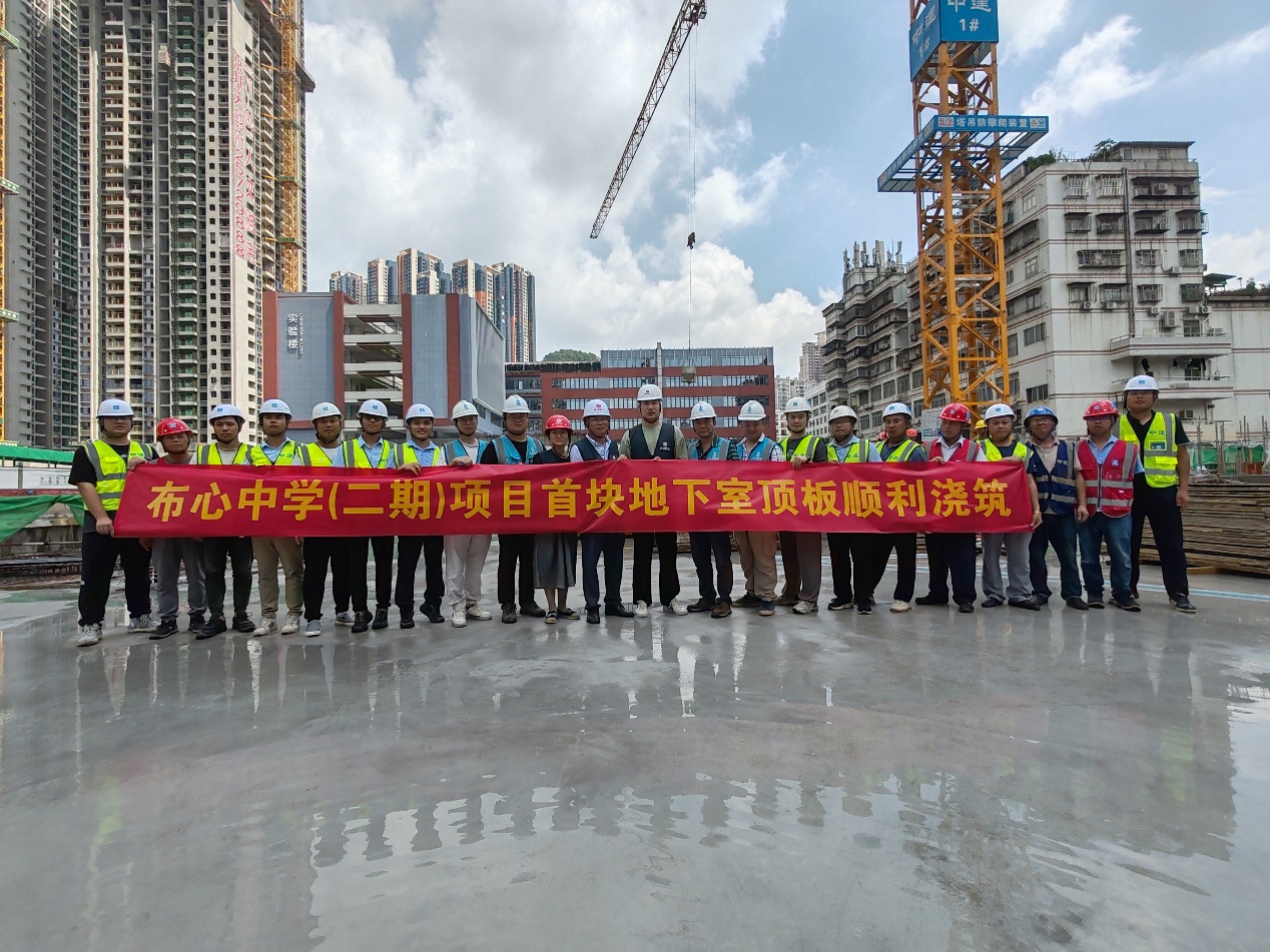 2023-08-19 布心中學項目首塊下室頂板順利澆筑 8月17日,隨著最后一方混凝土傾瀉而下,羅湖區(qū)布心中學項目首塊地下室頂板順利澆筑完成,標志著項目施工取得階段性突破、整體工程建設取得突破性進展,同時工程建設正式進入地上主體結(jié)構(gòu)施工階段,也在完美履約的道路上走出堅實的一步。