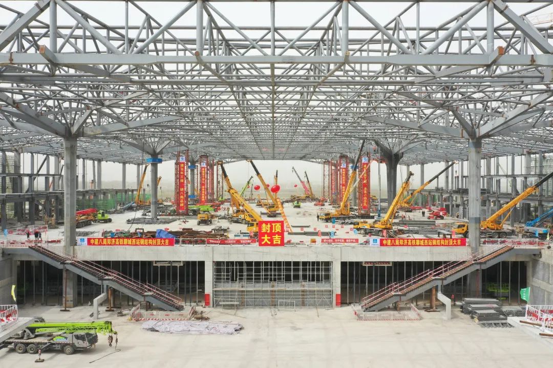 2023-03-25 濟(jì)鄭高鐵聊城西站封頂 3月24日,隨著最后一塊大跨度屋蓋鋼桁架安裝完成,濟(jì)鄭高鐵站房項(xiàng)目聊城西站提前完成鋼結(jié)構(gòu)封頂,標(biāo)志著濟(jì)鄭高鐵山東段4座站房全部封頂,全面進(jìn)入裝飾裝修階段,年底通車指日可待!