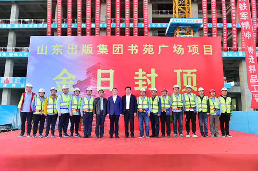 10月14日,一公司山東出版集團圖書展示樓項目喜迎封頂。 山東新源文化置業(yè)有限公司董事長李濤、總經理孫明,濟南建設監(jiān)理有限公司董事長林峯,山東意匠建筑設計有限公司副院長劉祥春,一公司黨委書記、董事長董文祥,濟南公司總經理霍文濤共同出席了封頂儀式。