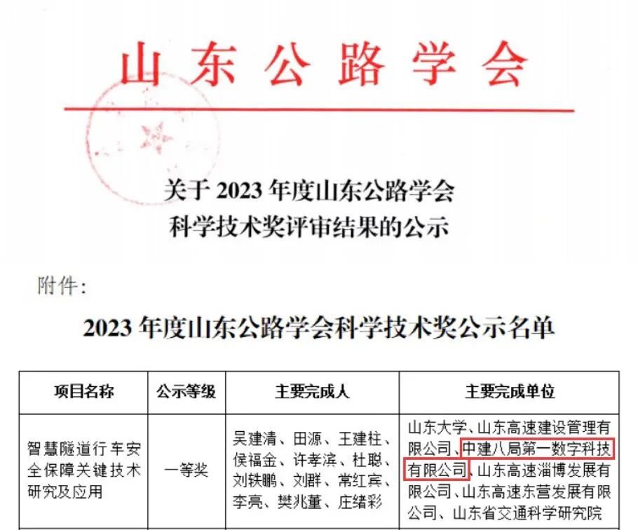 2023-06-18 中建八局一公司獲山東公路學(xué)會(huì)科學(xué)技術(shù)獎(jiǎng)一等獎(jiǎng) 近日,2023年度山東公路學(xué)會(huì)科學(xué)技術(shù)獎(jiǎng)完成評(píng)審結(jié)果公示,中建八局第一數(shù)字科技有限公司參與的”智慧隧道行車安全保障關(guān)鍵技術(shù)研究與應(yīng)用”科技創(chuàng)新項(xiàng)目獲評(píng)山東公路學(xué)會(huì)科學(xué)技術(shù)獎(jiǎng)一等獎(jiǎng)。