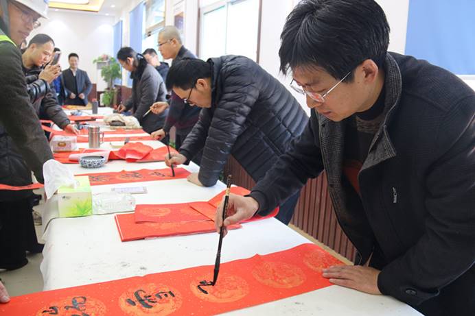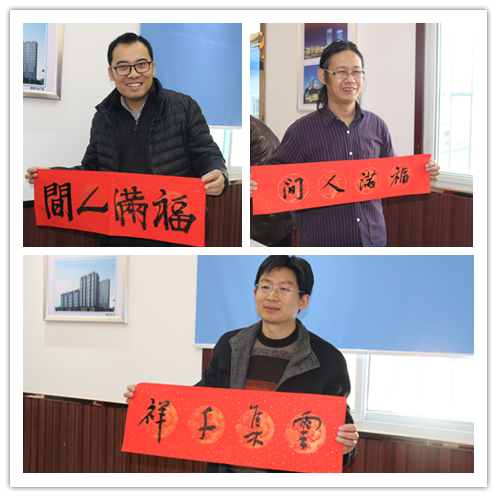 1月14日,公司濟(jì)南中央商務(wù)區(qū)安置區(qū)(CBD)項(xiàng)目熱鬧非凡。山東省青年書協(xié)常務(wù)副主席李成軍,省青年書協(xié)副主席兼秘書長(zhǎng)黨現(xiàn)強(qiáng),省青年書協(xié)副秘書長(zhǎng)、山東財(cái)經(jīng)大學(xué)副教授王子庸,省青年書協(xié)理事、市青年書協(xié)副主席王奇嵩四位書法家及公司書法協(xié)會(huì)成員徐偉、吳天均、張廣超,現(xiàn)場(chǎng)揮毫,一刻不得閑,一條條寫有新春祝福的對(duì)聯(lián),散發(fā)著清新墨香,一張張桌子前人頭攢動(dòng)。 230名來自濟(jì)南、安裝、基礎(chǔ)設(shè)施、裝飾四家二級(jí)單位在建項(xiàng)目的建筑工人,一邊誦讀著新春祝福,一邊嘖嘖稱贊,一張張笑臉洋溢著“帶幅春聯(lián)回家過年”的幸福憧憬?,F(xiàn)場(chǎng)嘉賓們忙著為建筑工人發(fā)放棉被,也紛紛對(duì)公司的“暖冬”策劃點(diǎn)贊。