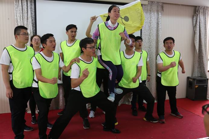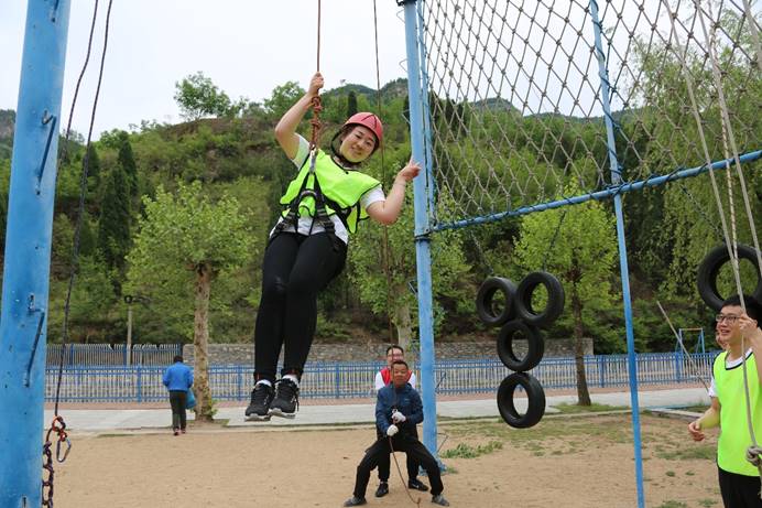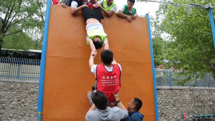 在培訓(xùn)講師的帶領(lǐng)下,大家穿上紅、黃、綠、藍(lán)四色馬甲,劃分為四組。在選隊(duì)長(zhǎng)、隊(duì)秘、起隊(duì)名、隊(duì)歌、口號(hào)中,拉近了彼此的距離也加深了彼此的熟悉?!案呖諗鄻颉笔且粋€(gè)勇敢者的游戲,更是一個(gè)團(tuán)結(jié)協(xié)作的游戲,青年們克服內(nèi)心的恐懼,突破自我極限,勇敢走上“高空斷橋”,地面上的小伙們也在團(tuán)結(jié)協(xié)作,拉住繩索,為高空中行走的人保持穩(wěn)定的環(huán)境,在大家的努力下,“恐高癥”患者也成功走過高空斷橋,完美完成任務(wù)。在令人恐懼的指壓板環(huán)節(jié),大家密切配合,在疼痛中奔跑,不斷刷新通過記錄。在活動(dòng)最后,也是最為艱難、最為感動(dòng)的翻越“畢業(yè)墻”環(huán)節(jié),40名青年要翻越一面高4.2米的光滑墻面,在此過程中,大家不能借助任何外界的工具,所能用的資源只有每個(gè)人的身體。“八一”青年通過搭人梯的方法,發(fā)揮各自優(yōu)勢(shì),身體強(qiáng)壯的自愿擔(dān)任底座,力量大的在墻上拉人,通過上下密切協(xié)作,不拋棄、不放棄,拼盡全力,最終只用了15分鐘完成全部翻越任務(wù),受到了講師的一致好評(píng),青年們也在配合挑戰(zhàn)中感受到了團(tuán)隊(duì)的力量、為彼此的信任和幫助而感動(dòng)。