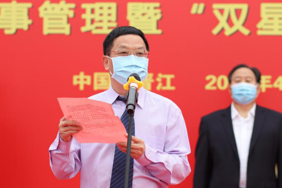 各級領(lǐng)導(dǎo)共同觸摸啟動球并宣布晉江新絲路文教園項目勞動競賽、“三號聯(lián)創(chuàng)”、準(zhǔn)軍事管理暨“雙星”活動正式啟動。