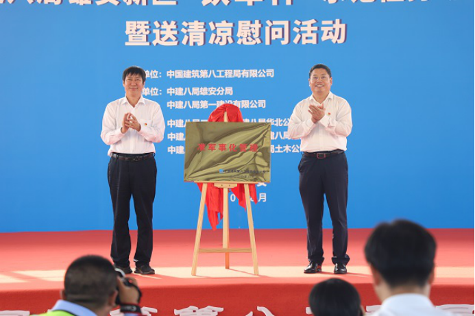 8月12日早晨7:30,中建八局雄安新區(qū)“鐵軍杯”示范性勞動(dòng)競(jìng)賽暨送清涼慰問(wèn)活動(dòng),在雄安站樞紐片區(qū)市政道路、綜合管廊、排水管網(wǎng)系統(tǒng)(一期)工程一標(biāo)段項(xiàng)目舉辦。本次勞動(dòng)競(jìng)賽受到雄安新區(qū)黨工委、管委會(huì)和雄安集團(tuán)的高度重視。雄安新區(qū)黨工委副書(shū)記、管委會(huì)常務(wù)副主任、中國(guó)雄安集團(tuán)有限公司黨委書(shū)記、董事長(zhǎng)田金昌,雄安集團(tuán)有限公司黨委副書(shū)記、總經(jīng)理劉中林,雄安新區(qū)黨工委委員、管委會(huì)副主任梁遠(yuǎn),雄安新區(qū)建設(shè)指揮部副總指揮、昝崗片區(qū)指揮部指揮長(zhǎng)張躍峰等39人應(yīng)邀出席活動(dòng)。