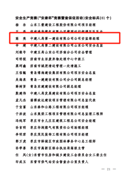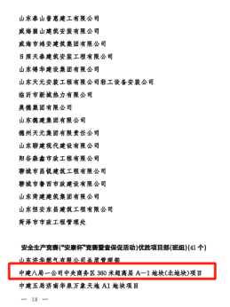 正值建黨百年之際,公司在山東省住建系統(tǒng)重點(diǎn)工作攻堅(jiān)勞動(dòng)競(jìng)賽先進(jìn)典型選樹(shù)活動(dòng)中斬獲多項(xiàng)榮譽(yù),包括山東省住建系統(tǒng)改革創(chuàng)新攻堅(jiān)競(jìng)賽示范企業(yè)(一公司)、山東省住建系統(tǒng)重點(diǎn)工程攻堅(jiān)勞動(dòng)競(jìng)賽示范企業(yè)(一公司)、山東省住建系統(tǒng)重點(diǎn)工程攻堅(jiān)勞動(dòng)競(jìng)賽示范項(xiàng)目部(魯南高鐵、農(nóng)業(yè)工程學(xué)院淄博校區(qū))、山東省住建系統(tǒng)安全生產(chǎn)競(jìng)賽(“安康杯”競(jìng)賽暨查保促活動(dòng))優(yōu)勝單位(一公司)、山東省住建系統(tǒng)安全生產(chǎn)競(jìng)賽(“安康杯”競(jìng)賽暨查保促活動(dòng))優(yōu)勝項(xiàng)目部(平安360)、山東省住建系統(tǒng)勞模和工匠人才創(chuàng)新工作室(趙忠楊超高層高效建造創(chuàng)新工作室)等6項(xiàng)集體榮譽(yù)和山東省住建系統(tǒng)改革創(chuàng)新標(biāo)兵(1人)、山東省住建系統(tǒng)重點(diǎn)工程攻堅(jiān)勞動(dòng)競(jìng)賽標(biāo)兵(2人)、山東省住建系統(tǒng)安全生產(chǎn)競(jìng)賽(“安康杯”競(jìng)賽暨查保促活動(dòng))安全標(biāo)兵(1人)等3項(xiàng)個(gè)人榮譽(yù)。