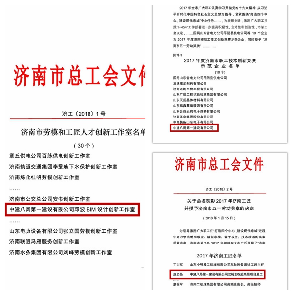 2018-03-11 公司榮獲多項(xiàng)濟(jì)南市總工會(huì)榮譽(yù) 近日,一年一度的濟(jì)南市總工會(huì)系統(tǒng)先進(jìn)集體和個(gè)人評(píng)比表彰結(jié)果揭曉,公司榮獲多項(xiàng)榮譽(yù)。 公司榮獲“2017年度濟(jì)南市職工技術(shù)創(chuàng)新競(jìng)賽示范企業(yè)”、“濟(jì)南市五一勞動(dòng)獎(jiǎng)狀”;公司鄧波BIM設(shè)計(jì)創(chuàng)新工作室榮獲“濟(jì)南市勞模和工匠人才創(chuàng)新工作室”榮譽(yù)稱號(hào);公司漢峪商務(wù)中心A5-3#樓及附屬設(shè)施工程項(xiàng)目總工程師趙忠楊榮獲“2017年濟(jì)南工匠”、“濟(jì)南市五一勞動(dòng)獎(jiǎng)?wù)隆睒s譽(yù)稱號(hào)...