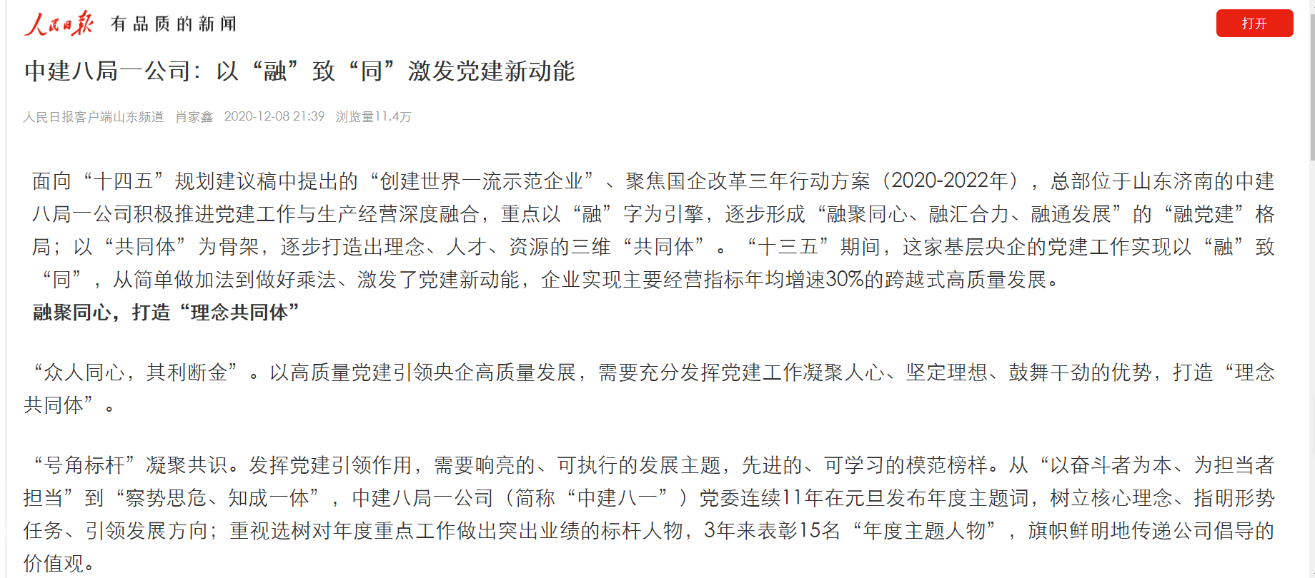 12月8日,《人民日?qǐng)?bào)》客戶端以《中建八局一公司:以“融”致“同”激發(fā)黨建新動(dòng)能》為題,全文刊發(fā)公司“融黨建”工作的經(jīng)驗(yàn)做法,瀏覽量很快突破10萬(wàn)+。