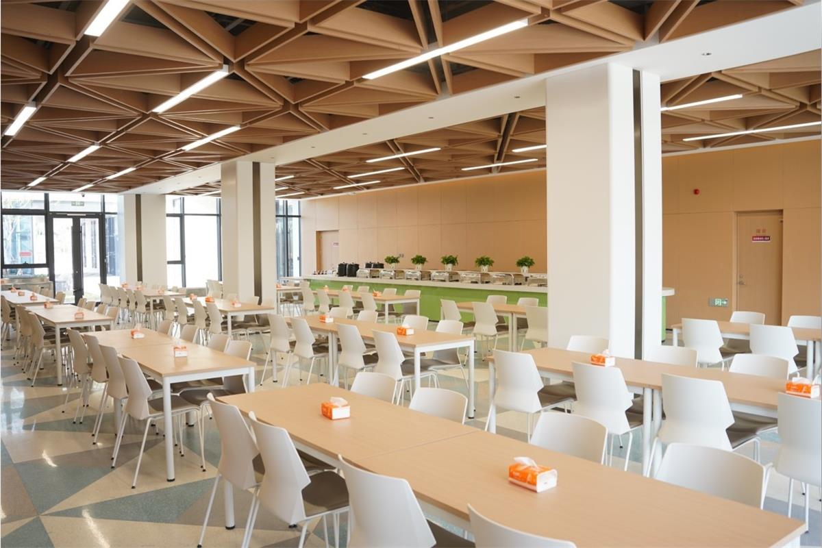 中心設(shè)置教學(xué)區(qū)、共享區(qū)與住宿區(qū)三大功能分區(qū)。其中教學(xué)區(qū)共有四間教室和一間可容納300人的報(bào)告廳。教室可滿足54人、96人、150人教學(xué)需求,適應(yīng)多種教學(xué)模式和場(chǎng)景。共享區(qū)配有餐廳、書(shū)吧、水吧和休息區(qū),供學(xué)員放松休息使用;住宿區(qū)公寓樓共四層,包含 88 間標(biāo)準(zhǔn)間客房,可容納170余人住宿使用。